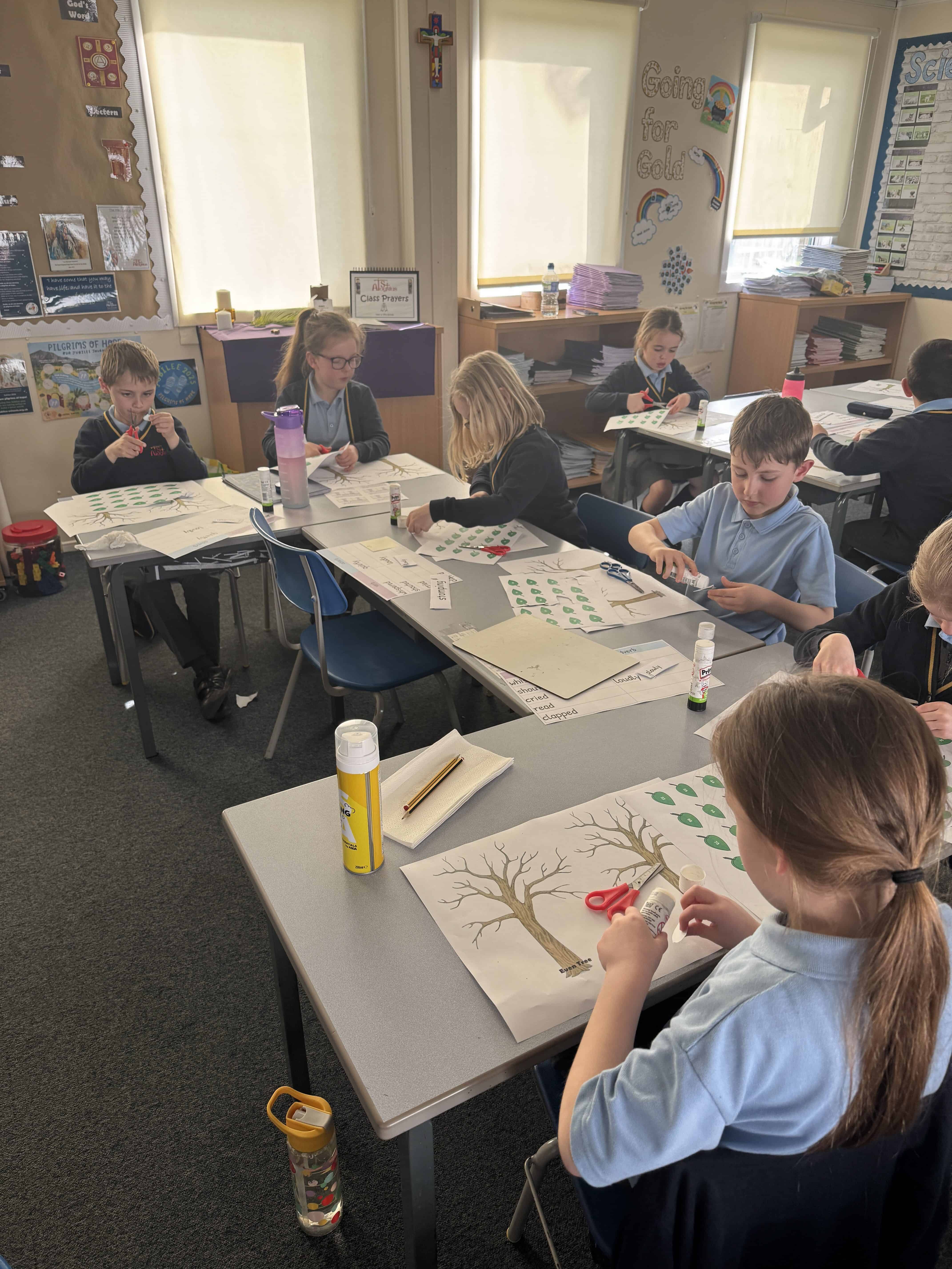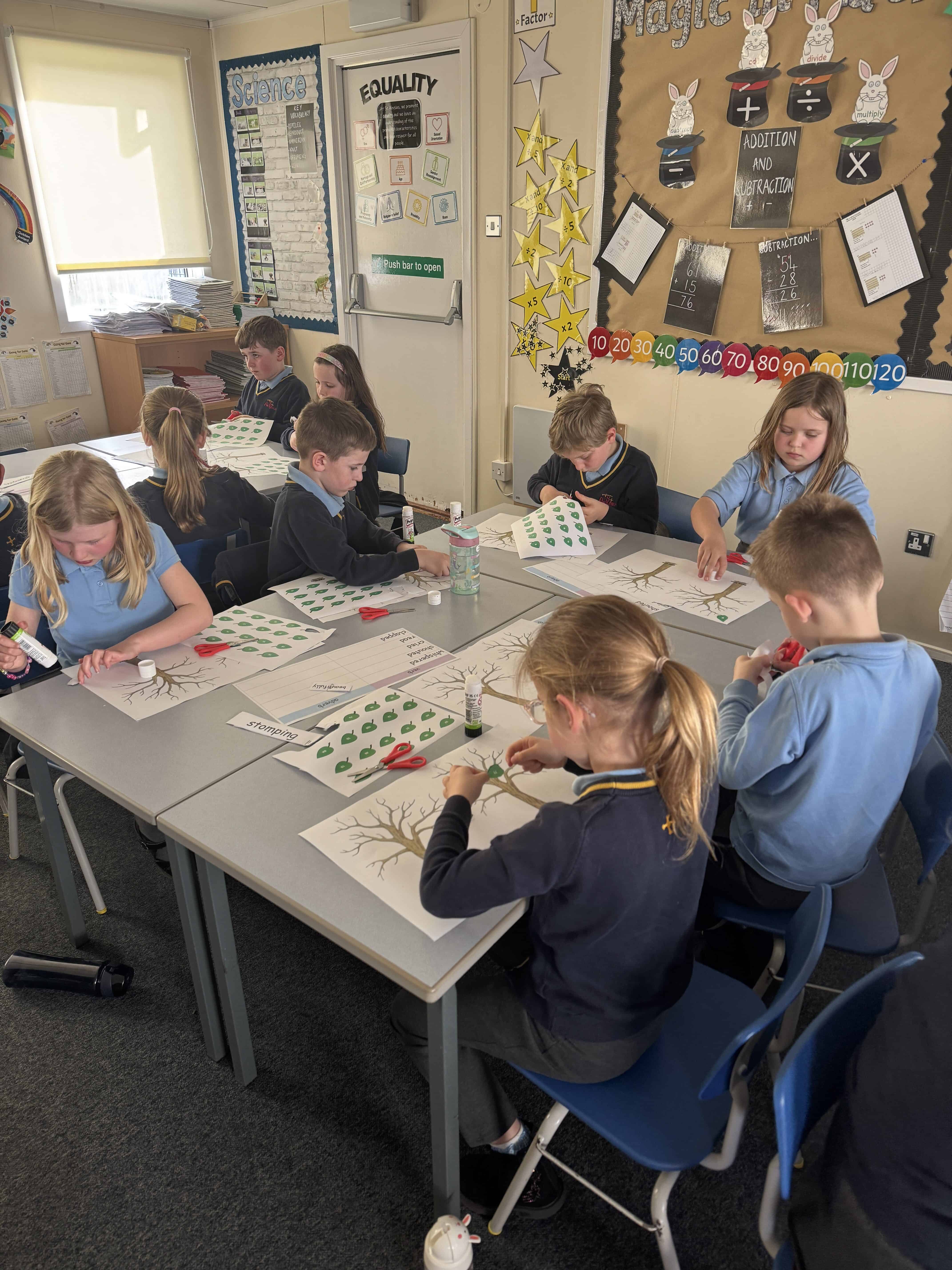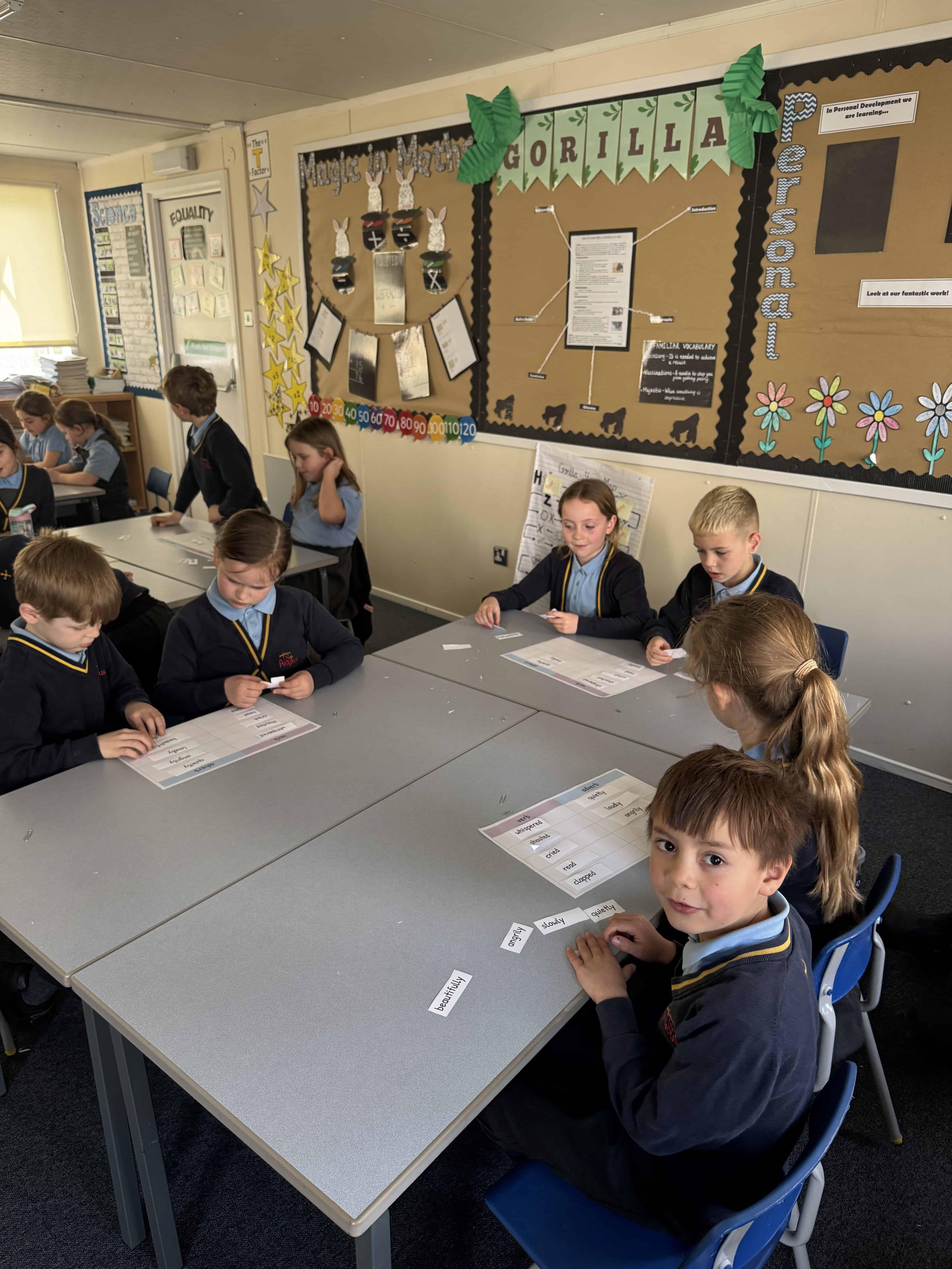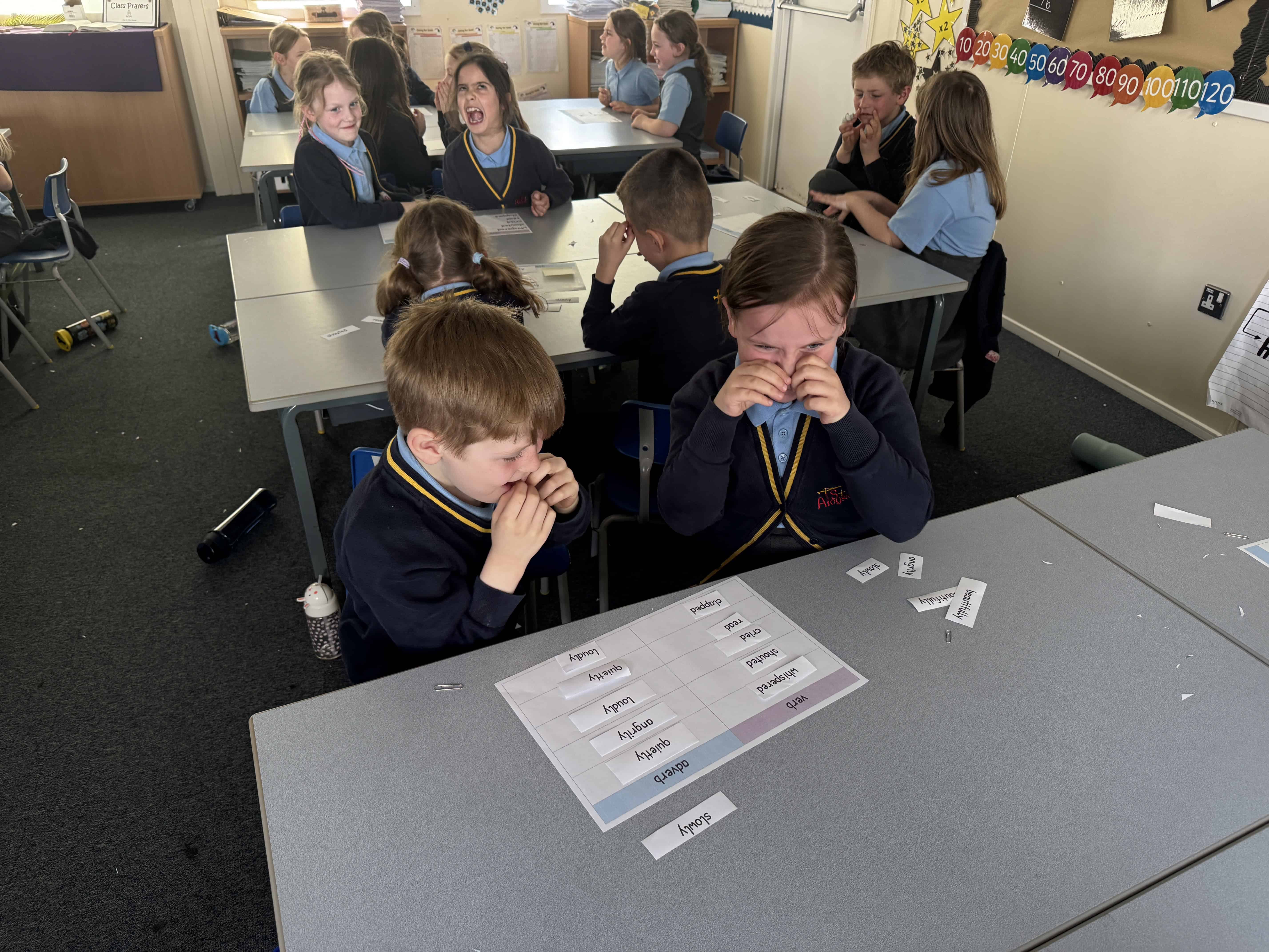 On Wednesday this week, it was No Pen Day in school. We still enjoyed our learning but in many different creative ways. Our day started with a music lesson, then we completed Personal Development where we had to share photos of the special people in our lives. On the afternoon, we started with Maths. We were learning about odd and even numbers. We started by sorting the Numicon pieces into hoops and we discussed how to recognise if a number was odd or even. Then, we completed some ‘Odd and Even Trees’ by sorting the numbers. We finished with English where we had to match verbs and adverbs. We acted out the phrases and then had LOTS of fun writing sentences with the verbs and adverbs into shaving foam.